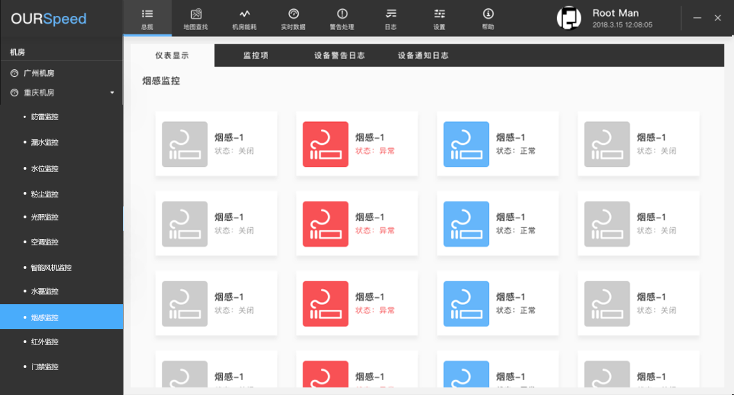 烟感:通过在机房的天花板上布置烟雾感应器,烟感输出信号通过4芯电源线连接到SPD-6500GSM系列环境监控主机开关量接口,当机房出现烟雾时,系统会立即报警,通知机房管理人员。
