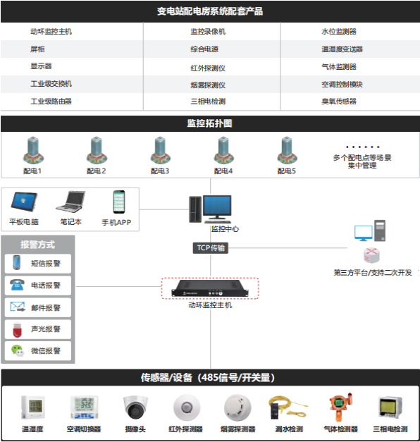 4. 采集层:前端采集传感器层,由前端传感器采集环境、动力、安全等监控信息,与监控主机进行信息交互、展示、处理等,同时可联动可控设备进行智能联动。