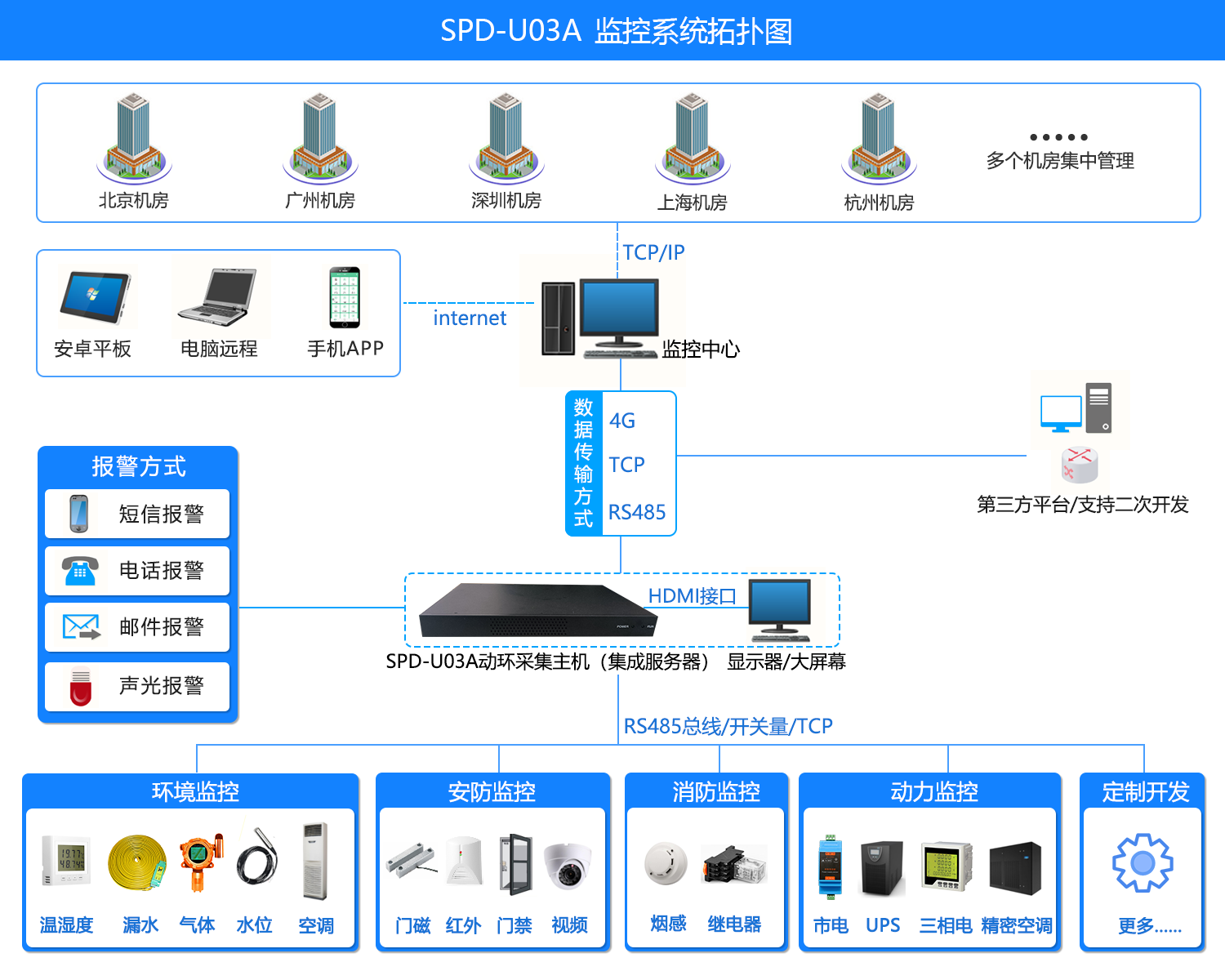 (5)接口丰富:系统提供基于RS485的MODBUS协议、SNMP协议、RS232串口等智能设备监控开发接口;同时系统还提供第三方接口,便于第三方软件兼容;