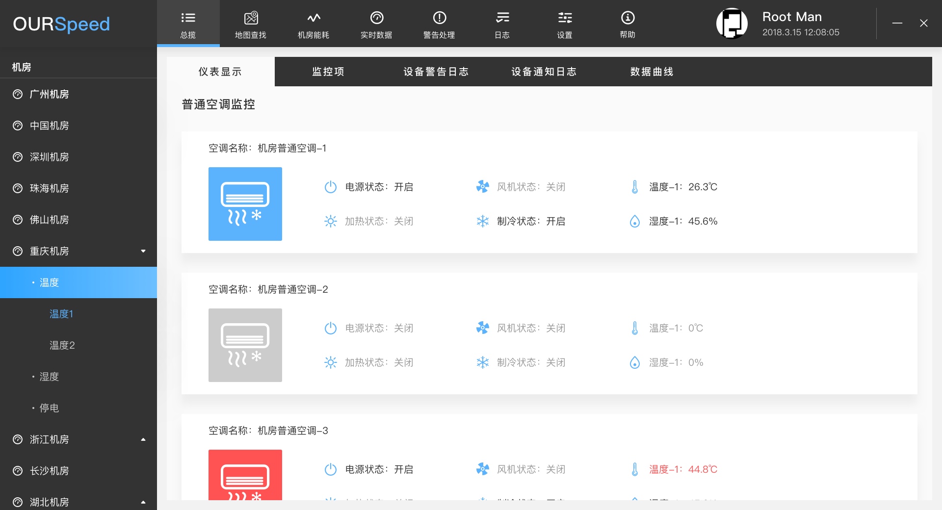 空调运行状态、空调的远程手动和自动控制,对普通空调的控制提供两种模式的控制,自动控制、手动控制。自动模式包括温湿度联动控制、多空调轮值控制、定时开关控制等。手动模式即通过监控主机网页或者OURSPEED监控管理平台来远程控制空调。